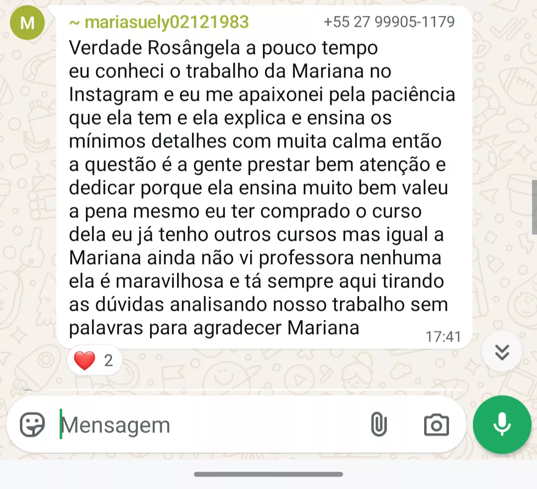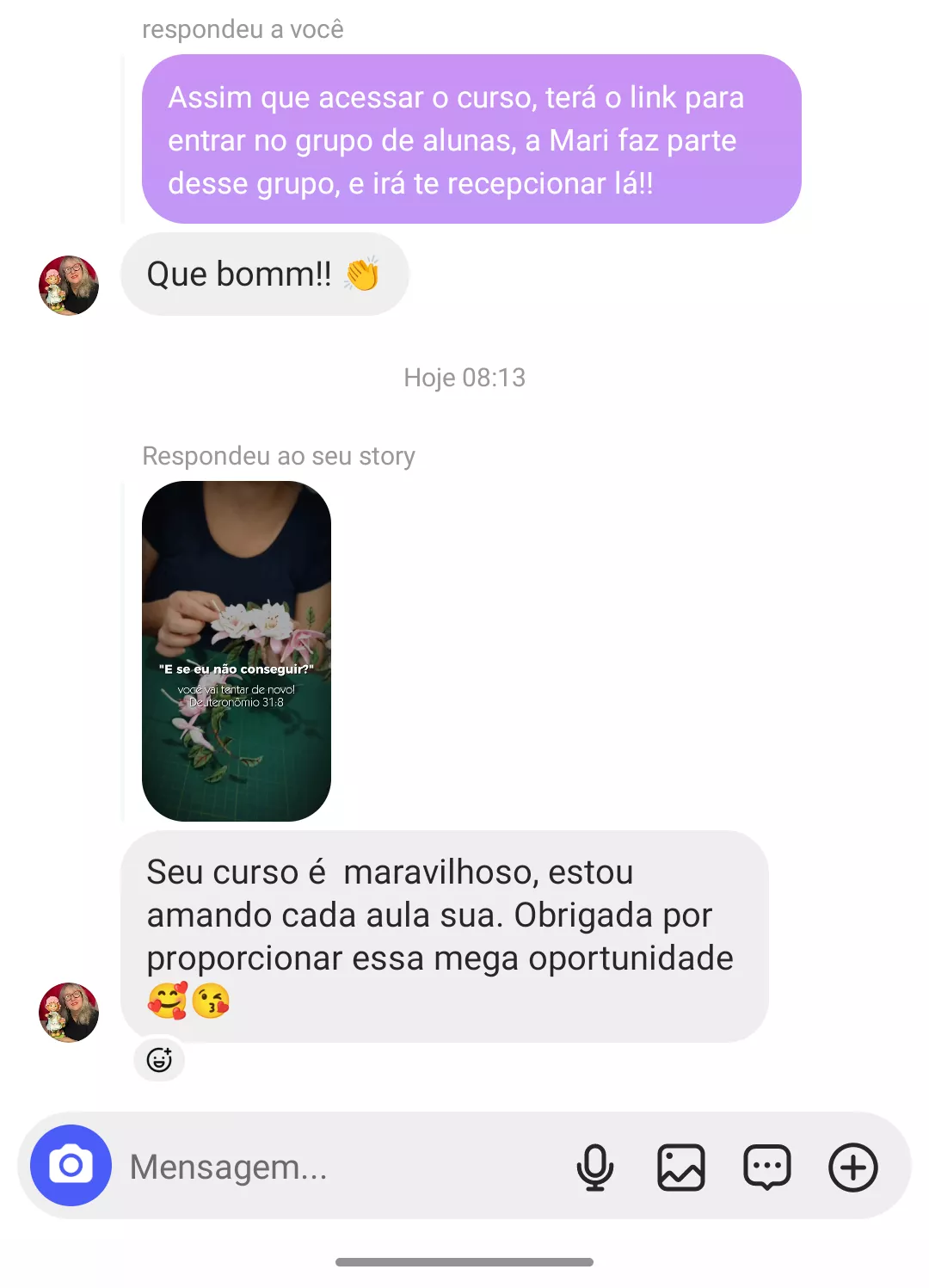 Ao se inscrever no "AURORA", você ganhará acesso ao nosso grupo exclusivo no WhatsApp, onde a magia continua mesmo após as aulas! Essa comunidade é um espaço dedicado aos alunos para que eles possam se conectar diretamente com a professora e possam compartilhar conhecimento com outros alunos.